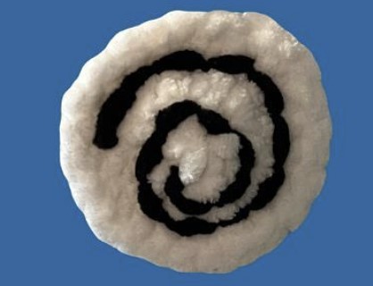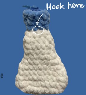 To crochet the blue details, turn the tail to the side and insert your hook into the marked space as shown in the picture. Pull up a loop, then crochet the blue details over the white parts of the tail following the instructions below: