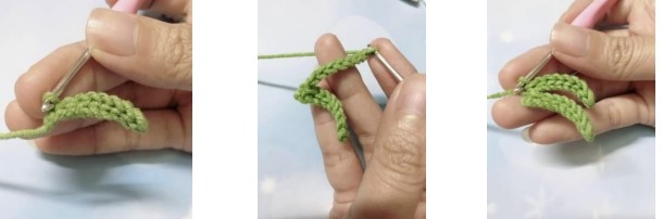 (make 9 ch, start in the second ch from the hook : 8 sl st ) repeat 3 times