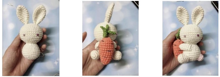 The crocheted toy can be used as a keychain due to its small size, but you need to sew the carrot that the bunny is holding in it’s lap tightly to the bunny’s hands.