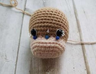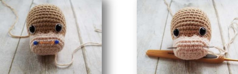 We outline 2 points for the nostrils. We introduce the yarn at one of the points, then into the next nostril, pull it down.