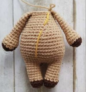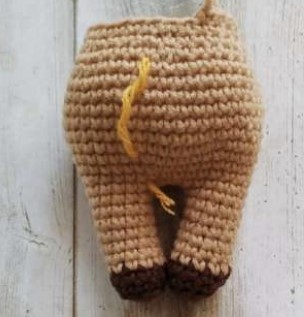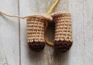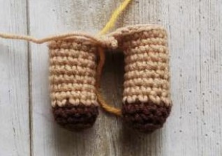 Continue crocheting with beige yarn. Connect the legs: 3ch, slst at the base of the last st of the first leg, 12 sc along the first leg, 3 sc along the chain of ch, 12 sc along the second leg, 3 sc along the back of the ch. (30)