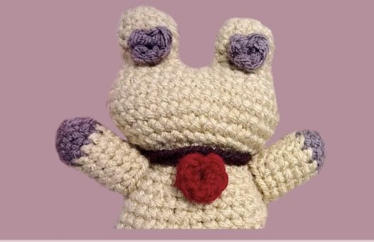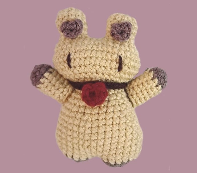 To make the heart necklace, use green/dark brown color. Ch19 and put it around her neck. Then slst to the first ch at the backside and FO.