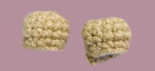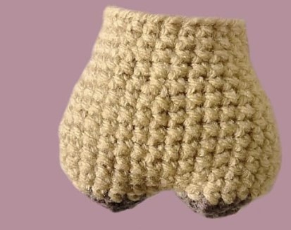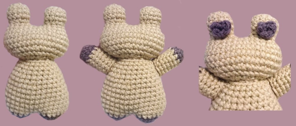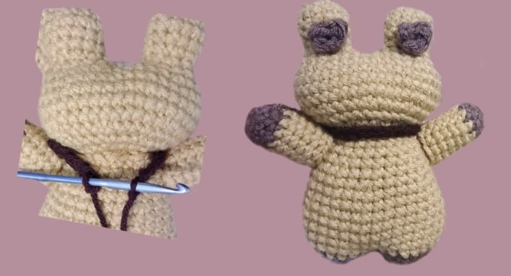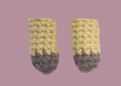 FO the first leg but DO NOT FO the second leg. Change the color to beige, chi and connect it to the first stitch of R3 of the first leg. Make a sc and this will count as the first stitch of R4
