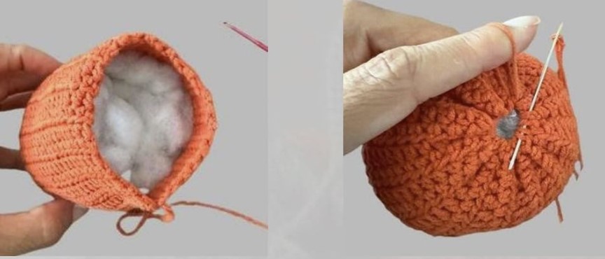 Exit the needle through the inner side to close the opening of the pumpkin later, but first stuff it with fiberfill.