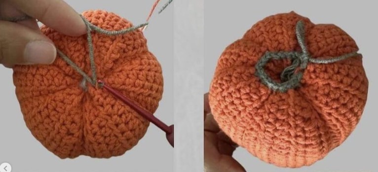 Attach the khaki green yarn to the top of the pumpkin (see photo), crochet 21 sc.