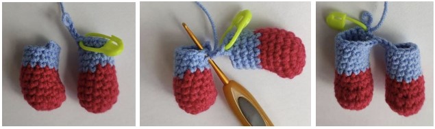 R14. light blue 11 sc, red 9 sc, light blue 1 sc, red 9 sc, light blue 24 sc (54)