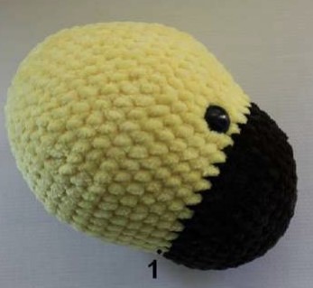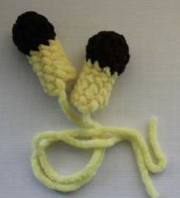 Round 10.7 sc, 6 sc with leg, 15 sc, 6 sc with second leg, 8 sc (42)