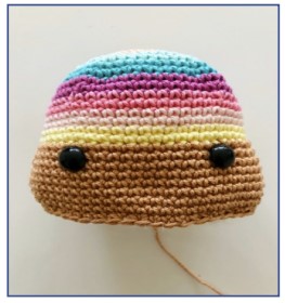 Insert the safety eyes between R 20 and 21 with 9 stitches between them. Embroider a small white stitch underneath the eyes.