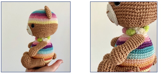 R8 – 17: 10sc (10sc) only stuff the hand part, don’t stuff the arm. Fold the arm and crochet the opposite stitches together with sc. Make a second arm and sew to the body.