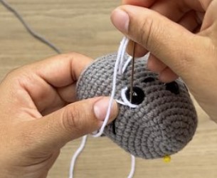 In row 11, 1sc apart from the right eye , use the needle and a black thread. Use the needle to make 2 sc for the left eye. Do this 3 more times to form the snout.