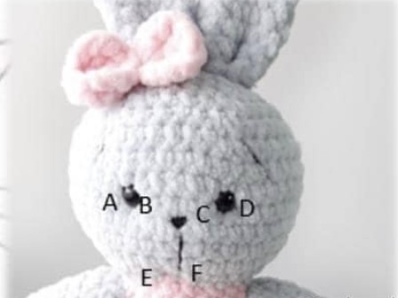 Sew on the ears. Make a tightening of the muzzle and embroider the nose. For tightening: take a needle and a black thread (it will not be visible when tightening). Point E and g in the 20th row at a distance of 1 sc. Insert the thread into point E, leaving a tail of 15 cm, bring it out from point A (directly under the eye as close as possible), insert it into point B (directly under the eye as close as possible), bring it out at point C (directly under the eye as close as possible), again insert it into point D (directly under the eye as close as possible) and bring it out from point.