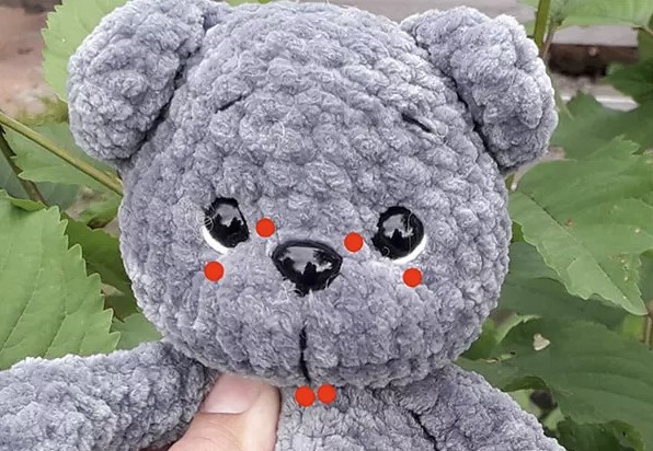 We insert the nose between rows 23-24, in the middle we insert the eyes between rows 24-25, between the eyes 5 sc.