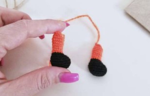 1Rnd: With black yarn, 5 ch in the 2nd loop from the hook, inc, 2 sc, 3 inc at the top, 3 sc along the back side of the chain – 10 sc