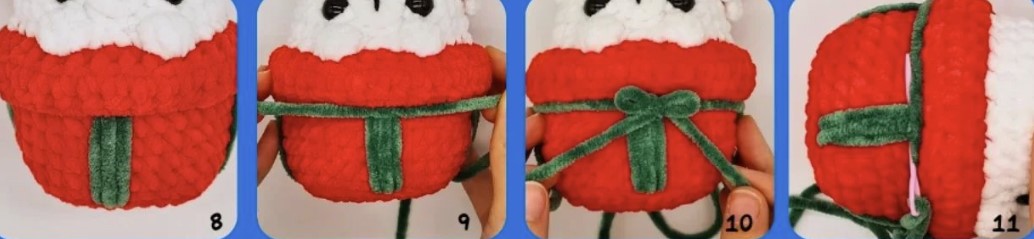 • Cut another long tail of red/green yarn and wrap it around the box making a bow (pic 9-10), with the remaining ends using a sewing needle go through the side on one stripe and exit on the other side of the same stripe (pic 11), do that for all the present’s side