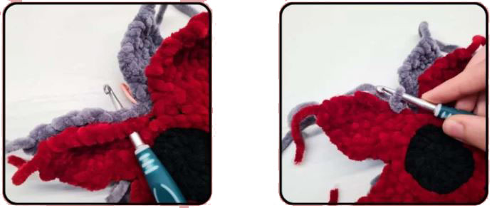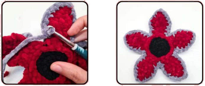 Insert the hook in the base of the red petal and in the specular st of the grey piece and ch1 (this chain doesn’t count as a st), then make: